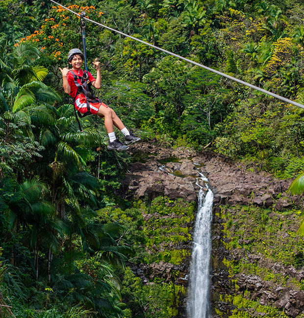 This is the only zipline in Hawaii that soars over a 250-foot waterfall! Zoom through a private paradise of lush jungle and tropical fruit agricultural fields (sampling encouraged!) on the first six lines. Then soar above a 450-foot ravine and over the mesmerizing 250-foot tall Kolekole Falls on the grand finale seventh line!